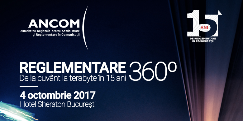 În data de 4 octombrie 2017, ANCOM organizează o nouă ediţie a conferinţei sale internaţionale, intitulată “Reglementare 360⁰ - de la cuvânt la terabyte, în 15 ani”. Evenimentul va avea loc la hotelul Sheraton din Bucureşti, incepand cu ora 14.00.