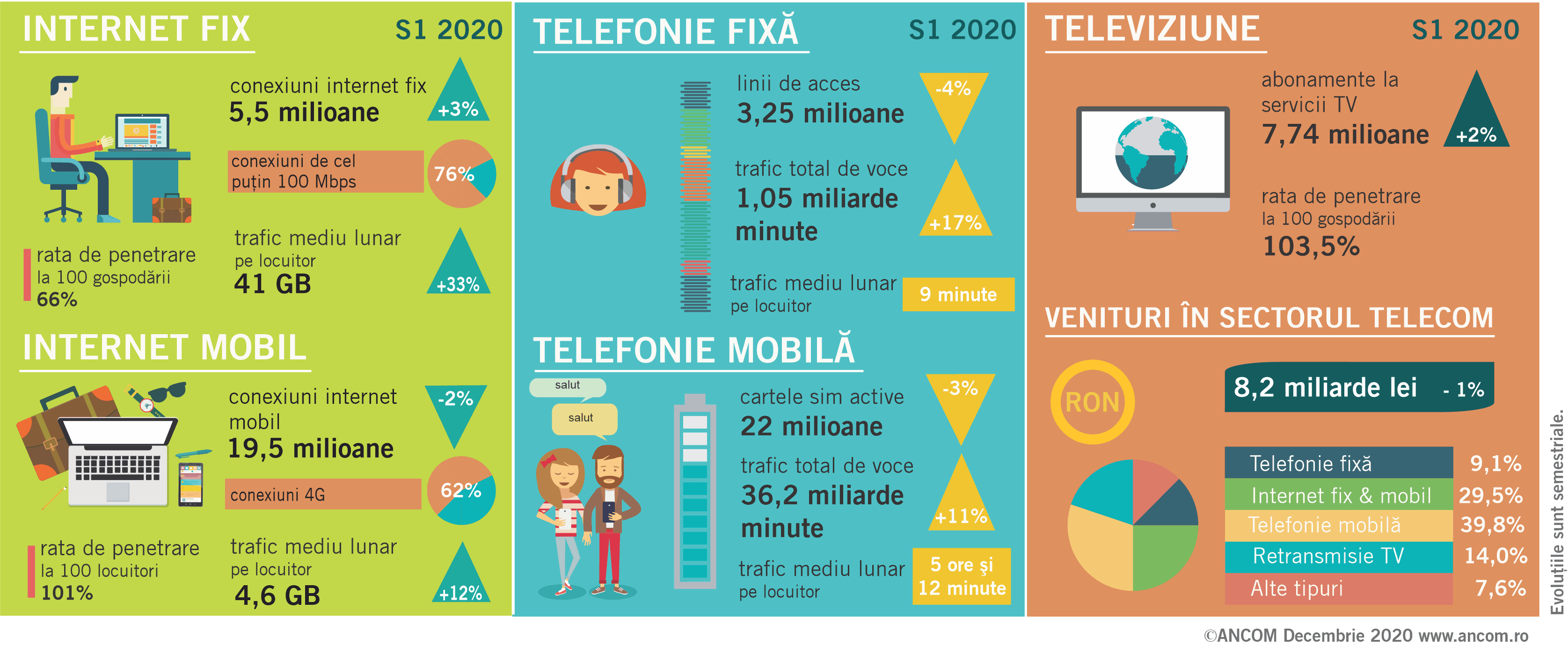 „Evoluții istorice excepționale și multe inversari de tendințe pe fondul crizei sanitare sunt evidențiate de statisticile ANCOM pentru piața de comunicații în primul semestru al anului: cea mai mare creștere semestriala a traficului de internet fix (+33%) din 2015 încoace și totodata, cea mai mica crestere semestriala a traficului de internet mobil (+12%) din aceeași perioada. Conexiunile rurale de internet fix cresc cu 7%, fața de numai 1% în urban. În telefonia mobila, scaderea istorica a numarului de cartele preplatite (-9%) a fost însoțita de creșterea traficului de voce (+12%), pe seama cresterii duratei apelurilor. Chiar și traficul de telefonie fixa a crescut (+17%), dupa scaderi continue ani la rândul.”, a declarat vicepreședintele ANCOM, Eduard LOVIN, la evenimentul Gala Digital Transformation 2020. Infografic aici.