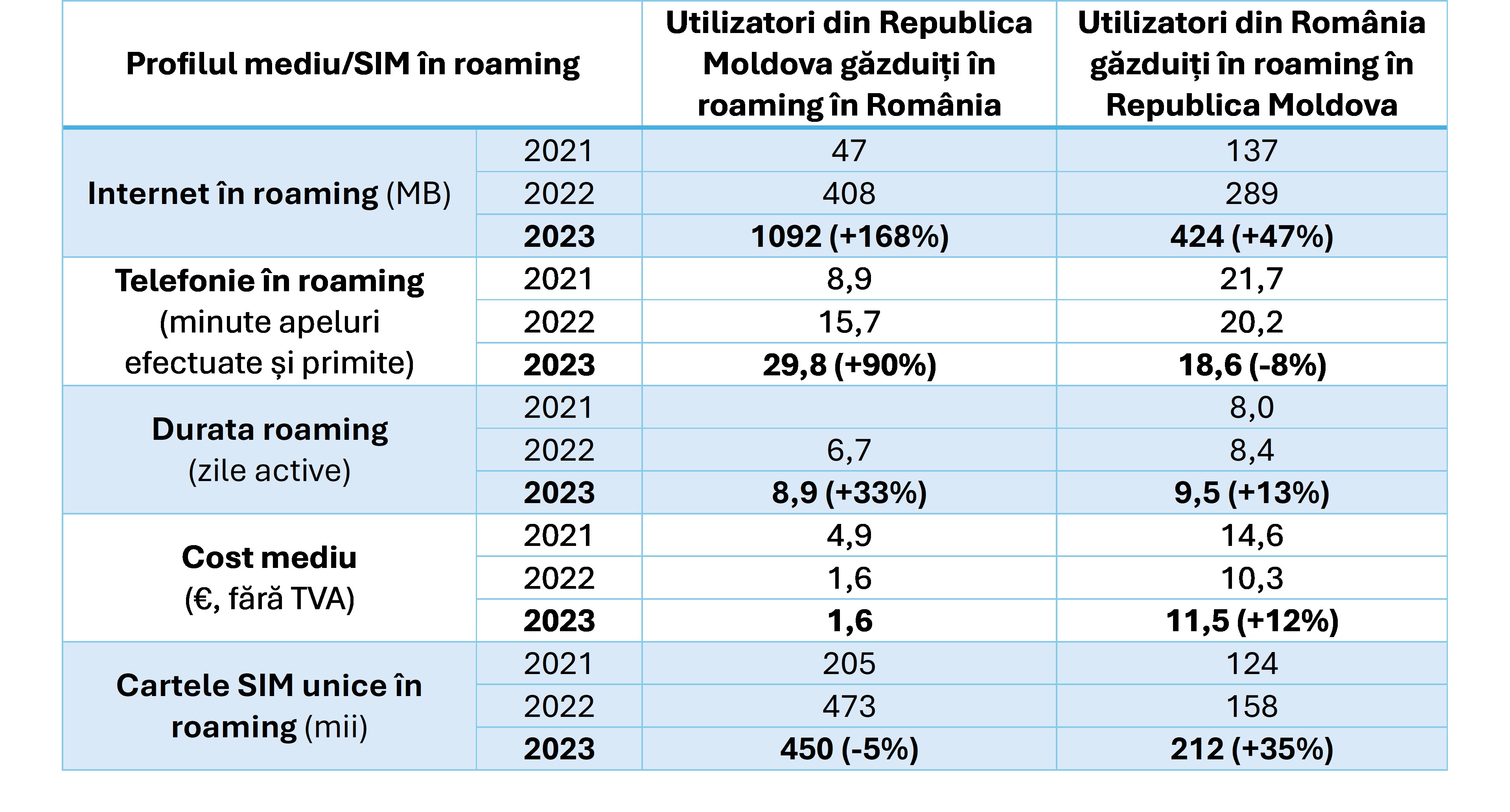 1% din utilizatorii de comunicații mobile din România și, respectiv, 10% din cei din Republica Moldova au efectuat în total 6 milioane de zile de roaming în statul vecin în 2023. Profilul mediu de consum a continuat să înregistreze creșteri semnificative, evidențiate în tabelul următor.