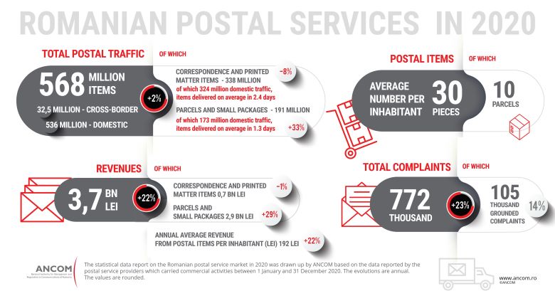 “The increase in the parcel traffic and the reduction of the delivery times, together with the increase in the number of providers, the enhancement of competition and the installation of parcel lockers are the main features of the postal service market in 2020. The sanitary crisis and the electronic commerce spread out and this is visible in the traffic and revenues specific to the postal service market. The delivery of online orders has thus become the main driver of the postal sector”, Mr. Eduard Lovin, vice-president of ANCOM, has said. Infographic here.