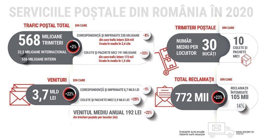 Din totalul de 568 de milioane de trimiteri poștale (în creștere cu 2% fata de anul 2019), coletele au ajuns sa reprezinte o treime (34%, de la 26% în 2019), în timp ce trimiterile de corespondența reprezinta 59%. Creșterea robusta a traficului de colete a alimentat avansul cu 22% în anul 2020 al veniturilor obținute din furnizarea serviciilor poștale, pâna la valoarea de 3,7 miliarde de lei. Numarul mediu de trimiteri poștale pe locuitor a fost de 30, din care 10 au fost colete.