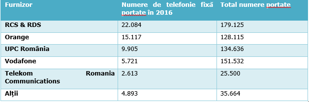 În anul 2016 au fost portate de două ori mai puține numere de telefonie fixă decât în anul 2015. Majoritatea celor 60.333de numere de telefonie fixă portate în anul 2016 au fost împărțite între principalii furnizori, astfel: RCS & RDS – 22.084, Orange – 15.117, UPC România – 9.905, Vodafone - 5.721 și Telekom Romania Communications – 2.613.