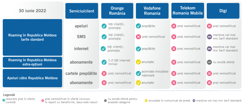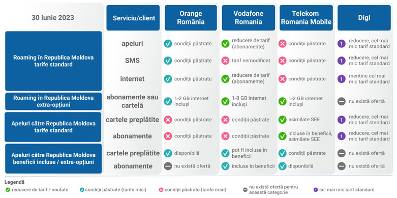 4 august 2023 ATENȚIONARE! În contextul perioadei vacanțelor, ANCOM recomandă utilizatorilor care plănuiesc călătorii în Republica Moldova să verifice la furnizor tarifele pentru internetul în roaming în statul vecin, înainte de a se angaja în consumul masiv al acestui serviciu pe parcursul călătoriei. Deși marea majoritate a ofertelor operatorilor din România pentru internetul în roaming în Republica Moldova sunt cu tarife mici, competitive, unii clienți cu contracte mai vechi sau cu planuri tarifare neactualizate pot fi expuși unor costuri mari, așa cum erau tarifele standard în anii trecuți. Astfel de situații pot fi evitate prin actualizarea contractelor de abonament semnate înainte de 12 iulie 2019 sau prin activarea înainte de călătorie a unei extra-opțiuni cu prețuri foarte mici pentru internet în Republica Moldova, extra-opțiuni valabile atât pentru abonamente cât și pentru cartele preplătite.
