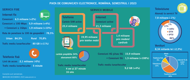Raportul ANCOM privind piața telecom în prima jumătate a anului 2023 este disponibil aici, principalele evoluţii fiind: